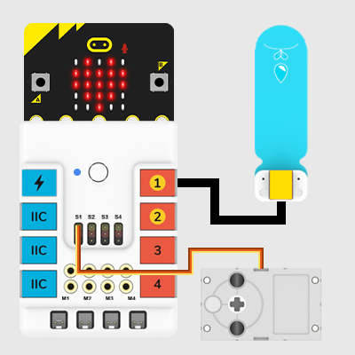 Conecte la micro: bit con la placa de expansión Nezha, conecte el servo al puerto S1 y el sensor de humedad al puerto J1 en la placa de expansión Nezha.
